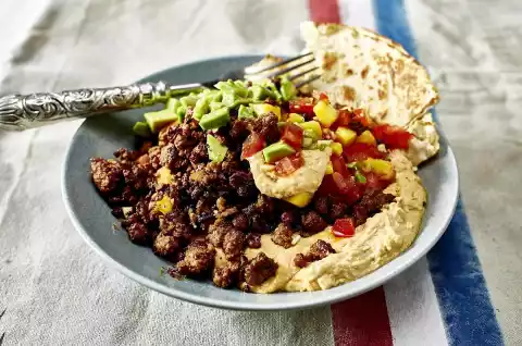 Cut the avocado in half, remove the stone. Remove the flesh from the peel and dice finely. Season the mince mixture to taste. Serve with hummus, tomato mixture and avocado. Add flatbread.