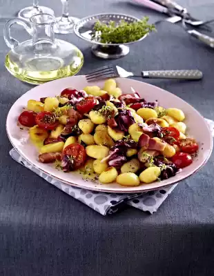 Fry the bacon in a large pan without fat until crispy. Peel and finely dice onion. Add to the bacon with gnocchi and fry for 6-8 minutes.