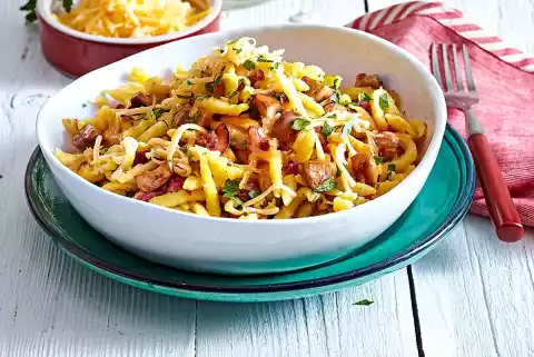 Clean the mushrooms, wash them if necessary and cut them in half or quarters depending on size. Heat butter in a large pan. Fry the mushrooms for about 5 minutes, then add diced ham and spaetzle. Continue frying for about 5 minutes while turning.