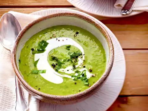 Wash the wild garlic, shake dry and chop. Finely puree the soup, stir in the wild garlic and crème fraîche. Season to taste with salt, pepper and 1 pinch of sugar.
