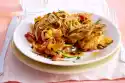 Peel and wash the carrots, cut them in half lengthwise and slice them. Clean, wash and halve the pointed cabbage and cut off the stalk. Cut cabbage into fine strips. Heat 1 tbsp. oil in a pot. Sauté the carrots in it. Add marinade, bring to the boil, cover and cook for about 5 minutes. Add pointed cabbage and continue cooking for 6-7 minutes.