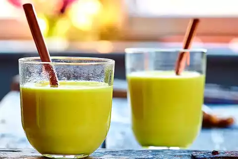 Peel 1 piece (approx. 10 g) of ginger and cut into slices. Bring to the boil briefly with 400 ml (1 tin) unsweetened coconut milk, 800 ml milk and 2 teaspoons turmeric in a pot and let it simmer at low heat for about 10 minutes. Sweeten with 2-3 tbsp. honey, pour through a sieve, fill into four glasses (each approx. 300 ml) and serve immediately.