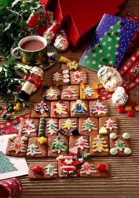 Paint eyes, shoes and numbers on the figures and biscuits with colourful sugar writing. Stick marzipan figures with icing on the three free cookies.