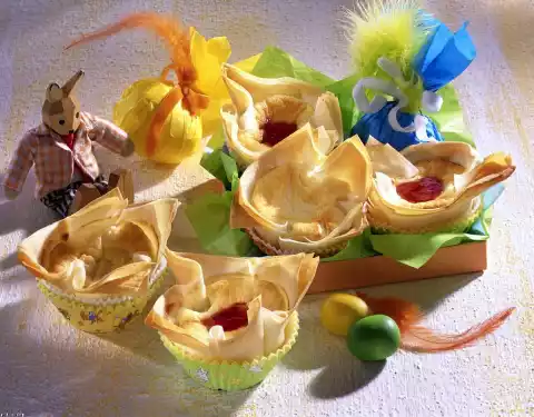 Repeat this procedure. Press the pastry sheets into a muffin tin (12 troughs) and put aside. Beat the eggs, egg yolks and sugar with the whisk of the hand mixer until creamy. Add quark and egg liqueur, stir in and add approx. 2 tablespoons to each of the dough baskets.