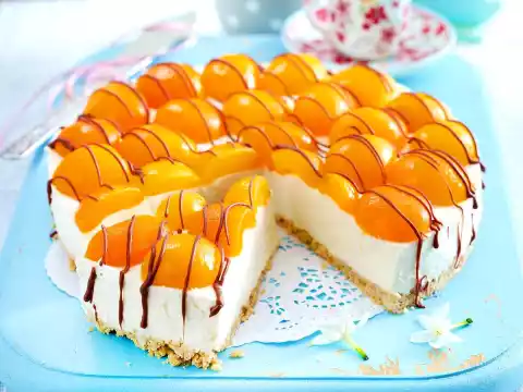 Pour the mixture into the mould, smooth it down and chill for at least 3 hours. Pour the apricots into a sieve and drain well, dab the undersides of the apricots with kitchen paper. Remove the cake from the mould. Cover cake surface with apricots.