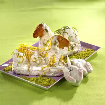 Spread the dough into the tins. Bake in the preheated oven (electric cooker: 175 °C/ convection oven: 150 °C/ gas: level 2) for 50-60 minutes. Leave to rest for 10 minutes, then remove from the mould and allow to cool. Stir icing sugar with egg white and lemon juice until smooth. Brush lambs with it, leaving out faces. Wash limes and lemons well, dab dry. Use a pestle remover to remove fine strips from the limes and lemons. Sprinkle the lambs with them. Stick 2 pistachios on each ear. Coarsely grind the remaining pistachios. Glue 4 corresponding pieces as eyes with a little bit of cast on. Let the icing dry.