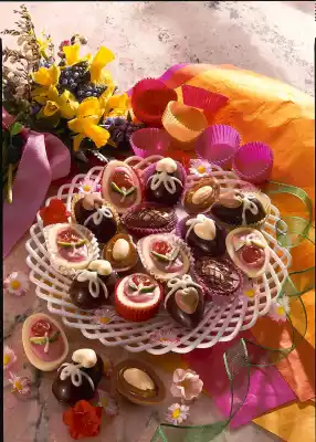 Turn the eggs over in the pallet. Melt the white couverture and put it in a freezer bag as well. Cut off a small corner. Dab white and whole milk hearts with some couverture and stick them on the eggs. Paint bows on the eggs and put them in a cool place for about 20 minutes. Put the eggs in chocolate cuffs and keep cool