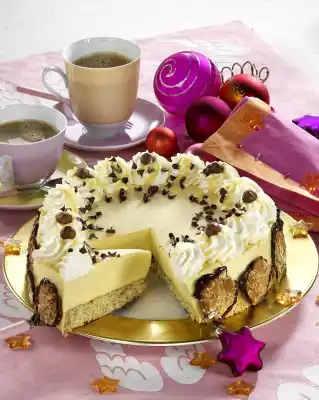 Whip 200 g cream until stiff and fill into a piping bag (star-shaped spout), taking care not to exceed 1 tbsp. Spray tuffs onto the cake. Spread the underside of the biscuits with the rest of the cream and press them against the edge of the cake. Decorate the cake with 1 tbsp. liqueur, nuts and chocolate rolls