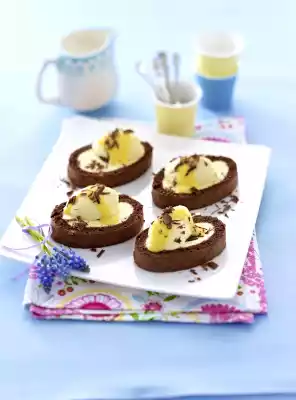 Cut the roll into about 16 slices. Use 2 tablespoons of the rest of the cream to cut off the cams, dipping the spoons repeatedly in hot water before doing so. Place one cam on each slice. Shortly before serving, sprinkle 100-150 ml of liqueur on each slice and sprinkle with grated chocolate.