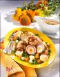 Chill the advocaat mousse for at least 4 hours. Wash the strawberries, dab dry very well, clean and halve. Lightly caramelise 120 g sugar in a pan, add strawberries and toss briefly in the caramel. Remove from heat. Use 2 tablespoons to prick the noodles out of the mousse and spread them on plates. Arrange the strawberries and caramel on the plates. Sprinkle with pistachios and decorate with mint as desired