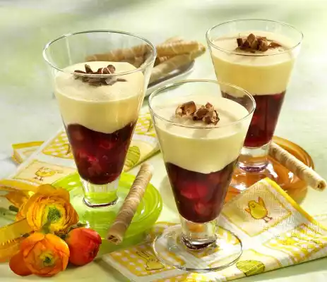Melt the gelatine dripping wet and stir into the egg-sugar mixture. Chill until the mixture begins to gel. Beat the egg whites until very stiff and fold into the mousse. Add the mousse to the cherry compote and chill for at least 3 hours. In the meantime, use a peeler to cut rolls from the chocolate and decorate desserts with them. Add the cookie rolls