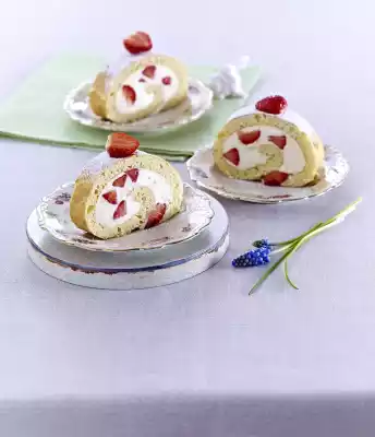 Unroll the sponge cake, spread the cream on top and spread evenly, chill for about 10 minutes. Roll up the sponge cake from the long side with the help of the cloth, refrigerate for about 2 hours. Dust the roll with icing sugar and cut into pieces. Cut the remaining strawberries in half. Decorate each piece with 1/2 strawberry