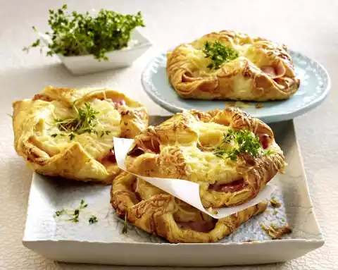 Remove the puff pastry from the fridge about 5 minutes before. Preheat the oven (electric cooker: 200 °C/circulating air: 175 °C/gas: see manufacturer). Line baking tray with baking paper. Cut ham slices in half.