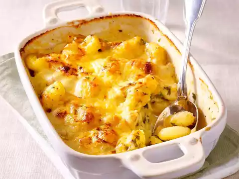 Put the gnocchi in an ovenproof dish. Mix cream, milk and parsley, season with salt, pepper and nutmeg. Pour over the gnocchi and sprinkle with cheese. Bake in a hot oven for about 15 minutes.