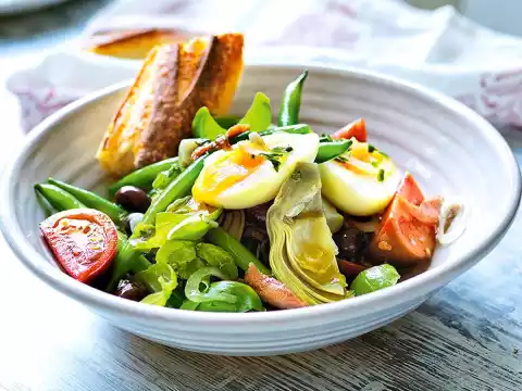 Cook the beans in boiling salted water for about 8 minutes, rinse and drain. Boil the eggs for about 6 minutes until they are waxy, quench, peel and halve them.