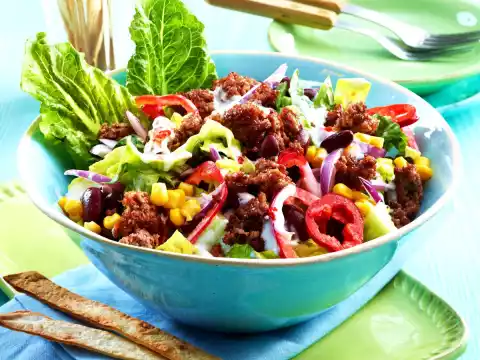 Fry the minced meat in hot oil until crumbly. Season well with salt, pepper and cayenne. Rinse the corn mix in a sieve and let it drain. Clean, wash, drain and cut the salad into strips. Clean, wash and cut the bell peppers into fine rings.