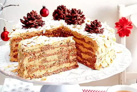 Spread 1 base with 1⁄6 cream. Place the 2nd floor on top and also spread it. Repeat until all floors are on top of each other. Spread the rest of the cream all around the cake and decorate with flaked almonds, leave to cool for about 2 hours. Dust with icing sugar and decorate with nougat chocolate suppositories.