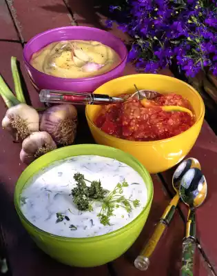 For the aioli, peel the garlic and press it through a garlic press. Mix with egg yolk, mustard and vinegar. Add oil while stirring constantly. Season with salt, pepper and curry