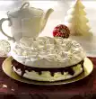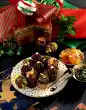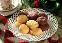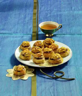Roll out the dough sheets on a lightly floured work surface, each 20 x 12 cm. Whisk egg yolk and cream and brush the dough plates with it. Roll up dark dough sticks and put them back in the fridge for at least 30 minutes. Cut the dough rolls into approx. 25 slices each and spread them on 4 baking trays lined with baking paper. Bake one after the other in a preheated oven (electric range: 175 °C/ convection oven: 150 °C/ gas: level 2) for approx. 12 minutes, allow to cool. (The biscuits can be kept for weeks if packed like this.) To decorate, cover the biscuits with the remaining walnut halves. Melt the sugar in a frying pan until golden yellow and drizzle gently over the walnuts
