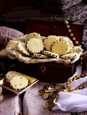 Cut rolls into 5-7 mm thick slices. Place on 2 baking trays lined with baking paper. Bake one after the other in a preheated oven (electric cooker: 150 °C/ convection oven: 125 °C/ gas: level 1) for 15-18 minutes. Take out and let cool down. Pack into a well sealable tin