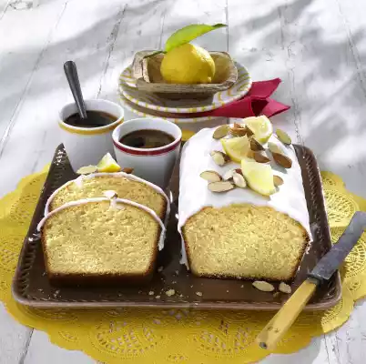 Pour the mixture into a greased, floured box form (approx. 20 cm, 1 1/2 litre capacity) and bake in a preheated oven (electric range: 175 °C/ convection oven: 150 °C/ gas: level 2) for 50-60 minutes. Remove the cake from the oven, turn out of the tin after approx. 10 minutes and let it cool down on a cake rack. Sieve icing sugar into a bowl and stir with 2-3 tablespoons of lemon juice to a thick icing. Spread the icing on the cake. Halve 3 lemon wedges and almonds and decorate the cake with them. Let the cake dry for about 1 hour