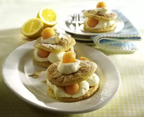 Pour into a piping bag and, except for something to decorate, spread over 4 bases. Spread the balls into the cream, except for 4 pieces. Finish with one base each and decorate with the rest of the cream and melon balls.