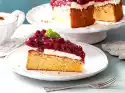 Place the cake on a cake rack and carefully remove the meringue from the edge with a knife. Let the cake cool down for about 20 minutes. Remove from the mould and lift onto a board or plate. Cut the cake horizontally with a long knife.