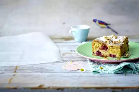 Stir in ground almonds, cinnamon, lemon and orange peel. Beat the egg white in 2 portions until stiff and fold in. Mix raspberries into the dough.