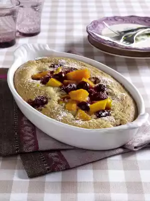 Mix the Amarettini, cherries and mango. Put half of the fruit in a greased, ovenproof dish (approx. 26 cm Ø) or pan (upper Ø approx. 30 cm) and pour the mixture on top. Spread the rest of the fruit on top. Bake in a preheated oven (electric cooker: 175 °C/ convection oven: 150 °C/ gas: level 2) for approx. 40 minutes. Dust the casserole with icing sugar