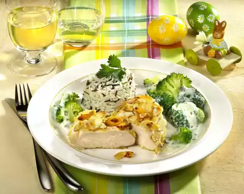 In the meantime heat up the fat in a pot. Dust with 1 tablespoon of flour and sauté briefly. Deglaze with vegetable stock and whipped cream while stirring and let simmer for about 5 minutes. Season with salt, pepper and nutmeg. Wash parsley, dab dry, pluck leaves from the stalks and, except for a few for garnishing, chop coarsely. Add parsley to the béchamel sauce and stir in. Arrange meat, rice, broccoli and béchamel sauce and garnish with parsley