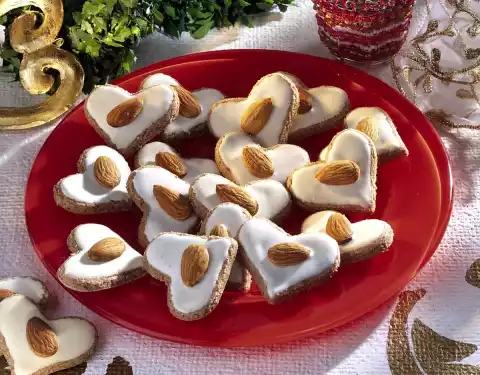 Beat the remaining egg white until stiff for the icing. Add icing sugar and stir in. Brush the hearts with the icing and place 1 almond on each. Bake in the preheated oven (electric: 150 °C/ gas: level 1) for 15-20 minutes on the lowest rack. After 5 minutes baking time cover if necessary and continue baking. Let cool off