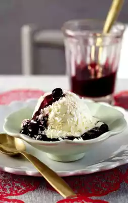 Shape half of the ice cream into 6 balls or cut into pieces (refreeze the remaining ice cream immediately). Roll the ice cream in coconut flakes one after the other. Arrange the ice cream with the hot blueberry sauce and serve immediately.