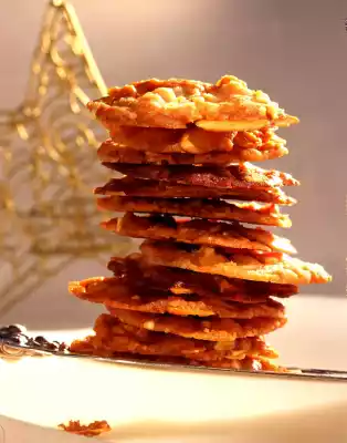 Place 1 teaspoon of dough in heaps on each of 3 baking trays lined with baking paper. Press flat (leave about 10 cm space between the piles, as the cookies will spread very thinly). Bake one after the other in a preheated oven (electric: 200 °C/ gas: level 3) for about 10 minutes. Let the cookies cool down a little on the hot baking tray, then lift them carefully off the baking tray and let them cool down on a cake rack. Results in approx. 48 pieces
