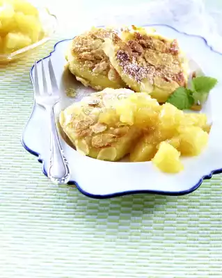 Melt half the clarified butter in a large coated pan. Fry the almond biscuits one after the other with the remaining clarified butter for about 5 minutes, turning them until golden brown. Mix 20 g sugar with cinnamon and sprinkle the finished almond biscuits. Arrange the almond cookies with apple compote, dust with icing sugar and decorate with lemon balm