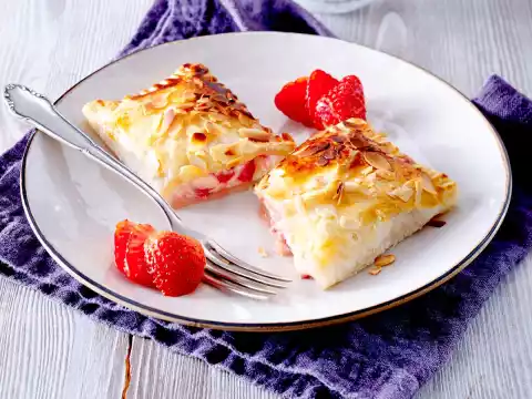 Remove the puff pastry pockets from the oven, arrange on plates and decorate with strawberry slices.
