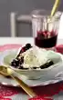 Roughly chop the almonds. Remove the ice cream mixture about 15 minutes before serving and let it temper. Cut off balls from the mixture, arrange in glass bowls and sprinkle with chopped almonds