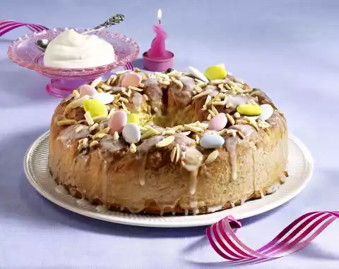 Knead in rum raisins, 150 g almond slivers and marzipan. Divide the dough into thirds and form into strands of about 60 cm each. Weave the strands into a braid and lay them on a baking tray lined with baking paper to form a wreath. Cover the inside and outside of the wreath with aluminium foil and let it rise for another 15 minutes. Whisk the egg yolk and cream, brush the wreath with it and bake in a preheated oven (electric cooker: 200 °C/ convection oven: 175 °C/ gas: level 3) for 35-40 minutes. Cover with aluminium foil if necessary. Let the wreath cool down on a cake rack. Mix icing sugar with lemon juice to a thin icing. Spread the wreath with it. Sprinkle with almond slivers and decorate with sugar eggs. Let the icing dry