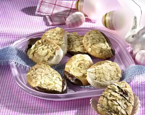 Pour the dough into a piping bag with a medium perforated spout and squirt 8 eggs (approx. 10 cm in size) onto a baking tray lined with baking paper, sprinkle with almonds and press down lightly. Bake the eggs in a preheated oven (electric cooker: 175 °C/ convection oven: 150 °C/ gas: level 2) for 15-20 minutes until golden brown.