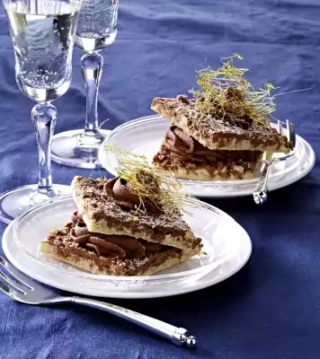 Melt the nougat chocolate over a warm water bath. Crumble and add the pastry. Carefully spread the chocolate mixture on the baked macaroon mass and chill for approx. 30 minutes