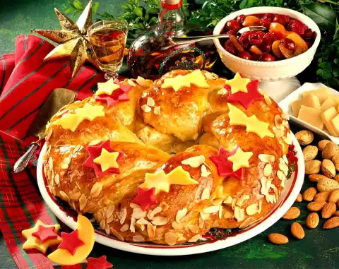Separate the egg and brush the edges with egg white. Roll up the strips from the long side and twist them into a strand. Form a wreath and press the ends together. Place on a baking tray lined with baking paper and leave to rise for another 15 minutes. Mix egg yolk and cream and spread the wreath with it. Bake in a preheated oven (electric: 200°C/ gas: level 3) for about 40 minutes. Cover at the end of the baking time if necessary. Roast the almonds. Knead icing sugar and remaining marzipan, divide the mixture and colour yellow and red with a few drops of food colouring. Roll out marzipan, cut out stars and moons. Warm up the jam, pass it through a sieve and spread it on the still warm wreath. Sprinkle with flaked almonds. Decorate the wreath with marzipan stars. Results in 28-30 slices