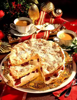 Spread half the dough into the mould. Beat the egg whites until stiff, adding 200 g icing sugar. Spread half of the beaten egg white on the dough and sprinkle half of the almonds over it. Bake in the preheated oven (electric cooker: 175 °C / convection oven: 150 °C / gas mark 2) for 20-25 minutes. Bake the remaining dough, beaten egg white and almonds in the same way. Let the cake base cool down