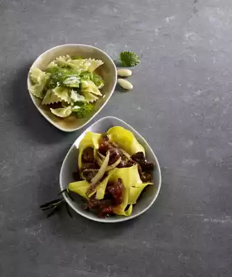 Pour into a bowl and stir in the oil. Season with salt and pepper. Prepare pasta in boiling salted water according to package instructions. Drain pasta, drain and arrange in bowls with pesto.