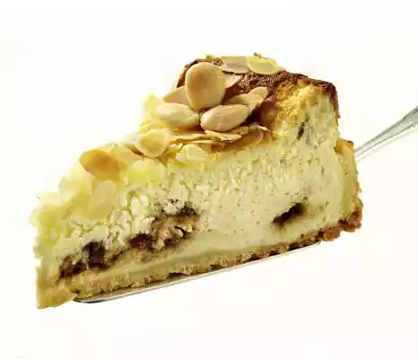 Line the form with it and press the dough on the edge. Prick the base several times with a fork and chill. Melt 50 g butter and let it cool down. Chop the sweets. Separate 7 eggs. Mix egg yolk, quark, sour cream, 150 g sugar, vanillin sugar and pudding powder with the whisks of the hand mixer. Beat egg whites and 50 g sugar until stiff. Carefully fold the sweets, beaten egg white and melted butter into the quark mixture. Pour the mixture onto the base. Sprinkle with almond flakes and kernels.