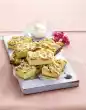 Mix egg yolk, quark, sour cream, 150 g sugar, vanillin sugar and pudding powder with the whisks of the hand mixer. Beat egg whites and 50 g sugar until stiff. Carefully fold the sweets, beaten egg white and melted butter into the quark mixture. Pour the mixture onto the base. Sprinkle with almond flakes and kernels. Bake the cake in a preheated oven (electric cooker: 175 °C/ convection oven: 150 °C/ gas: level 2) for about 1 hour. Place the cake on a grid, remove from the edge and allow to cool in the tin