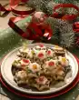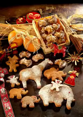 Place on a baking tray lined with baking paper. Brush with egg white and sprinkle with almond flakes. Bake in the preheated oven (electric cooker: 200 °C/ gas: level 3) for about 15 minutes. Let cool down on a cake rack. Dust with icing sugar. Results in approx. 45 pieces