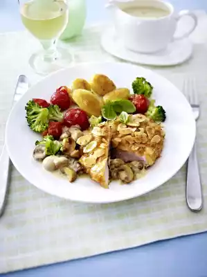 Heat 1 tablespoon of oil and butter. Steam cherry tomatoes and remaining shallots for 2-3 minutes. Season with salt, pepper and 1 pinch of sugar. Add broccoli and heat briefly. Arrange schnitzel with mushroom cream and vegetables.