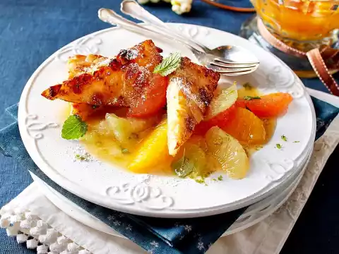 Caramelise 75 g sugar in a frying pan. Deglaze with citrus juice, add aniseed and simmer until the caramel has dissolved. Stir the starch with a little water until smooth, stir in and simmer for about 1 minute.
