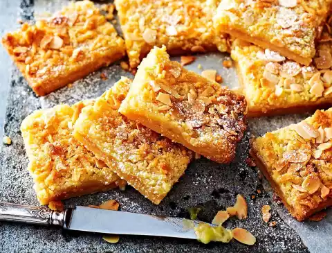 Spread Orange Curd on the floor, leaving about 1 cm of edge free. Spread the rest of the crumble on top. Bake at the same temperature for 20-25 minutes. Let the cake cool down on the tray. Cut into about 25 pieces.
