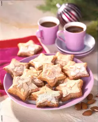 Place on two baking trays lined with baking paper. Pass 75 g icing sugar through a sieve. Beat the egg white with the whisk of the hand mixer until stiff. Add icing sugar bit by bit. Brush the stars with egg white icing and sprinkle with the flaked almonds. Bake the cookies one after the other in the preheated oven (electric cooker: 175 °C/ gas: level 2) for 18-20 minutes. Let the cookies cool down on a cake rack and sprinkle with the remaining icing sugar