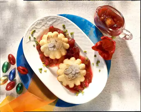 Remove from the heat and allow to cool. Turn out the tartlets from the moulds and arrange on small plates together with the stewed Rharbarber. Roast the flaked almonds in a dry pan until golden brown and sprinkle the tartlets with them. Serve dusted with icing sugar. Decorate as desired with chopped pistol seeds. Makes 8 pieces